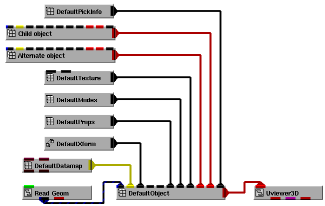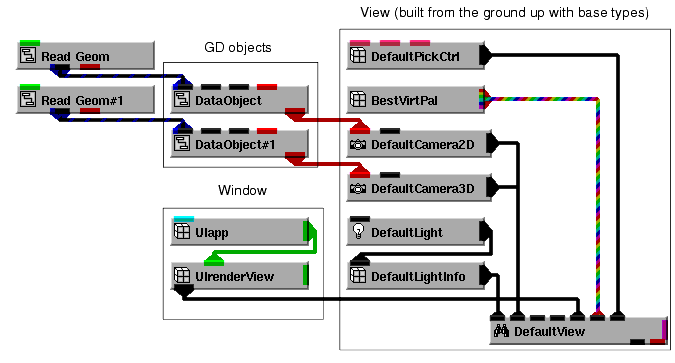Here is what the definition of a Graphics Display Kit object looks like, at the base-type level. Most of the base types defining a Graphics Display Kit object are optional. In the diagram, the object is connected into Uviewer3D, a macro that defines a full-featured renderer, including a view and a rendering window.