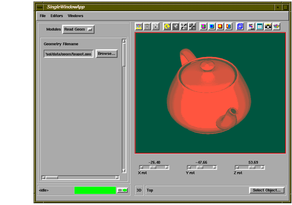 - We are now ready to specify a data file. In the SingleWindowApp window, select the Editors->Modules pull-down command. The user interface for Read_Geom will appear. Select thr browse button. A dialog box appears. Select teapot.geo, then select the OK button.