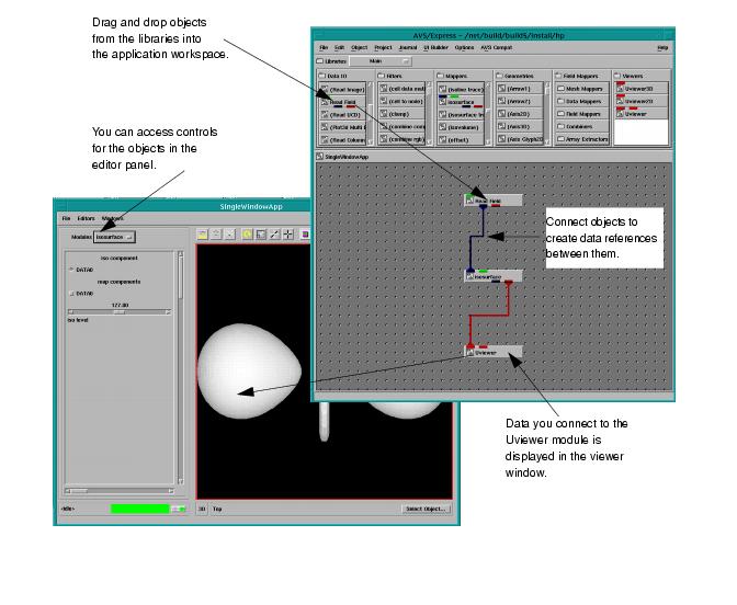 The bottom section of the Network Editor displays the current application workspace. You build your application in the workspace by using your mouse to drag template objects from the libraries into the workspace. When you drop the object into an application workspace, AVS/Express creates a copy of the template, called an instance. An instanced object is active, that is, AVS/Express executes the methods in the object. You can reference data between instanced objects by using your mouse in the workspace to draw connections between objects.