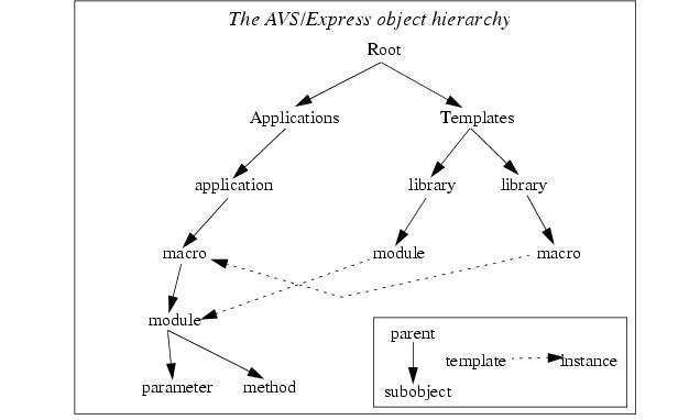 We have defined several different types of AVS/Express objects: macro, module, parameter, method, and library. Each of these objects is a subclass of a common object type called simply object. These objects are all stored in a single tree structure called the object hierarchy.