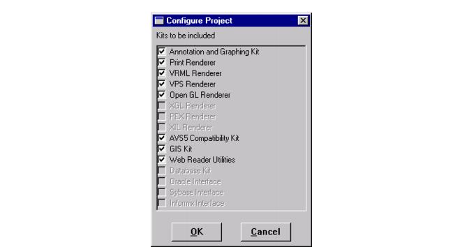 To change the configuration of the libraries saved in your project, select Configure from the Project menu. AVS/Express displays a list of libraries and renderers that you can exclude from your project: