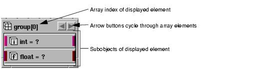 You can access individual elements in an array of groups. When an array of groups is open, it displays the subobjects of one element at a time. You can traverse the elements using arrow buttons in the object's title bar:
