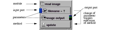 The connections between objects in the Network Editor are connections between parameters. A connection provides a conduit for the sharing of information between two objects. The methods in an AVS/Express execute in response to events that occur on the parameters of the object. Objects can send messages back and forth across connections to other objects without your needing to manage this communication explicitly. Thus you do not have to know of the existence of the methods and do not need to manage the execution of the object. This is called execution encapsulation. In AVS/Express objects that have parameters and methods and have their execution encapsulated are called modules.
