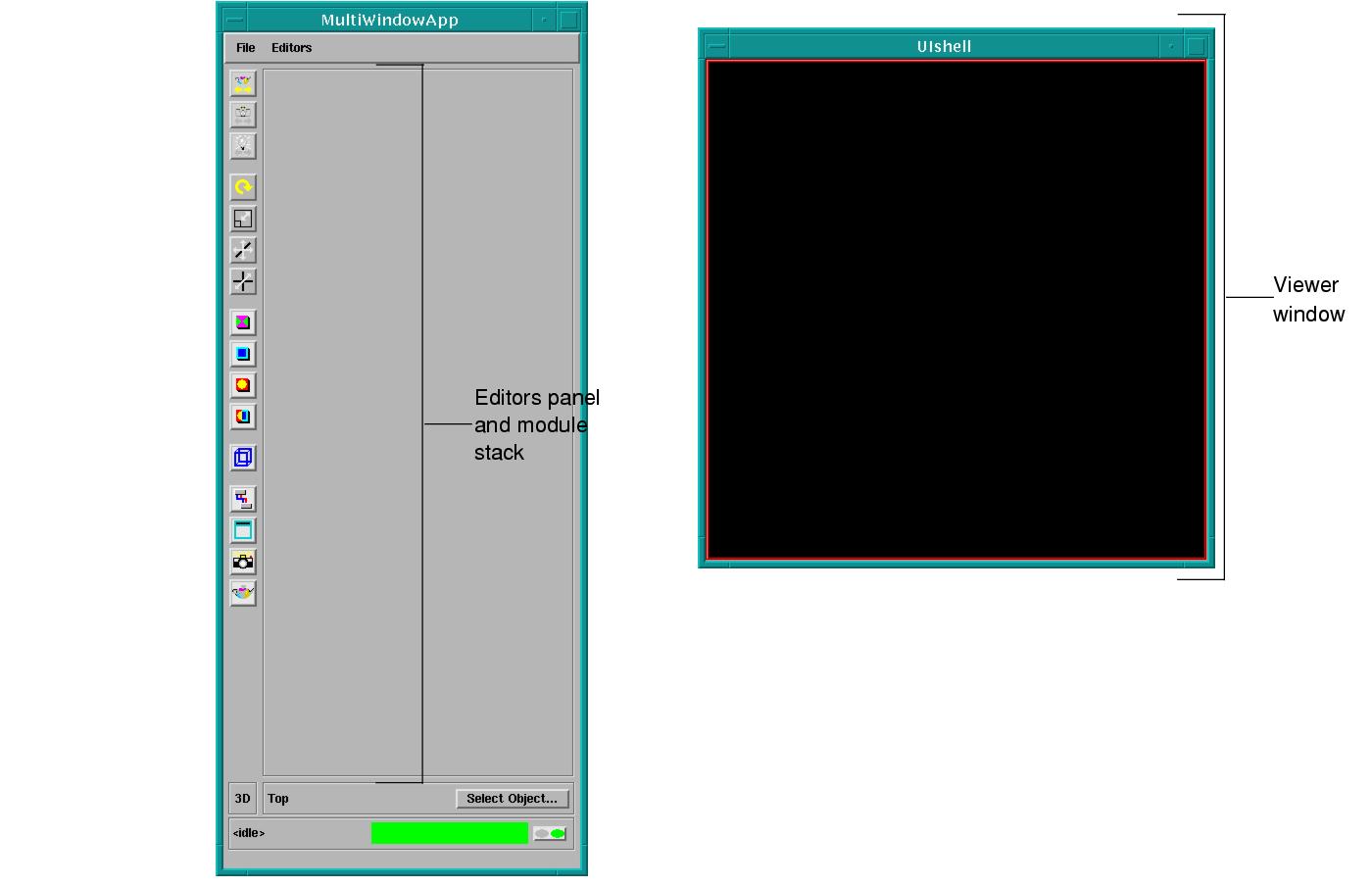 The multi-window DataViewer application creates two windows, a viewer window and a separate window for the editor controls: