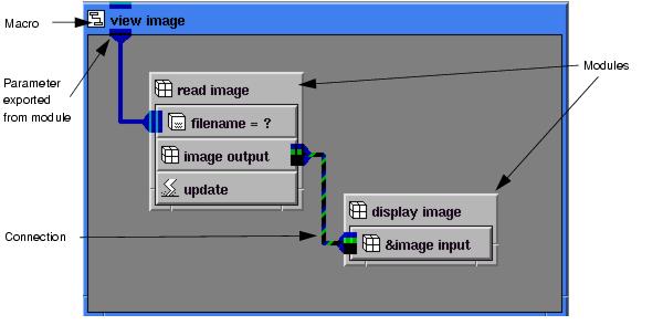 Groups of objects and their connections are called networks. You can build networks interactively by instancing template objects in the application workspace and connecting them using your mouse. By combining predefined objects you can quickly build a powerful application. The following illustration shows the implementation of a simple visualization network.