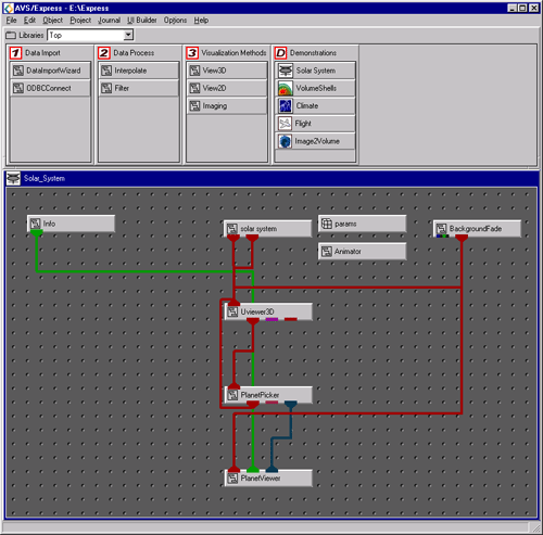 In AVS/Express, you begin building an application by finding the objects you need in the Libraries section of the Network Editor and then dragging them into the application workspace. This process is called instancing. When you instance an object, the AVS/Express Object Manager executes the functionality associated with that object.