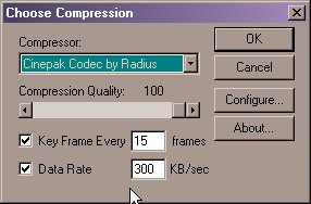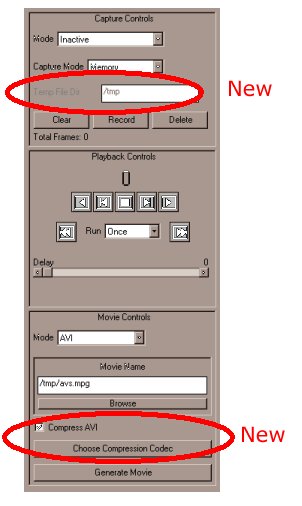 In both Windows and UNIX, the Image Capture module now contains the means to compress AVI files. In Windows, you have the ablity to choose the compression type as well as the settings. When the Movie Control Mode in the Windows version is selected to AVI, 2 new options are given. The first is a check box which asks if you wish to compress the AVI. If this is check the second button to choose the Compression Codec becomes available. By pressing this button a pop up screen comes up with a list of compressors that are available on the users machine. The user can then press configure to set the compression to compressor they wish.