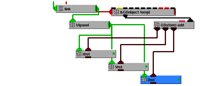 d. Connect Uview_link to GDtrack_edit.view. Connect Uview_link.picked_camera to GDtrack_edit.camera. Connect Uview_link.picked_obj to GDtrack_edit.obj. These provide the trackball editor with an object to edit as well as the view and camera which are needed to convert screen space XY positions into a transformation matrix.