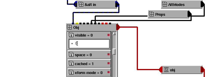 The following diagram, which shows how to do this, is taken from the AttribAltObj example that is found in Libraries.Examples.Graphics_Display. To see the objects shown in the network, maximize Read_Geom, maximize DataObject, maximize AltObject. Open AltModes, then open mode[5].