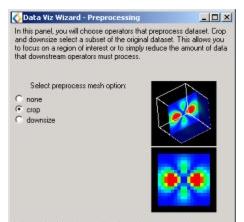 4. The next panel asks you how to preprocess your data. Preprocessing allows you to focus on a region of interest or to reduce the amount of data that the operators must process. In this tutorial we will be using the crop operator. Select