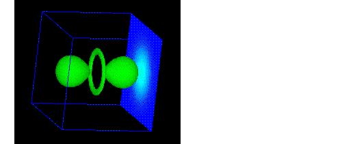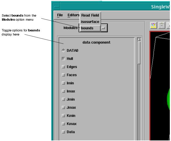 - The bounds object displays a bounding box around the hydrogen object in the view. It connects through an input port to the Read_Field object to reference the hydrogen data. Internally bounds calcuates the extents of the data from the field. It connects to the UViewer3D object to output a bounding box that represents the extents of the data in the viewer.