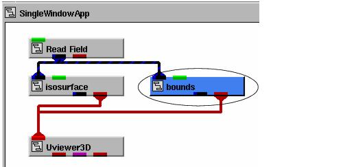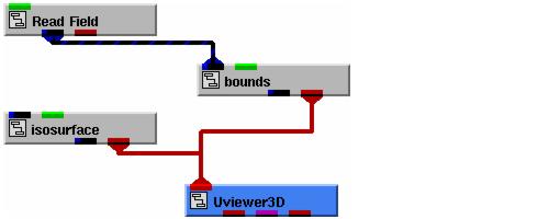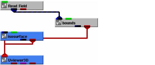 - You connect the left input port of bounds to the left output port of Read_Field. You connect the input port of Uviewer3D to the right output port of bounds.