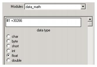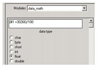 DataMath user interface panel by scrolling through the "modules" menu in the SingleWindowApp. In the type in box you will notice "#1." This refers to the first field input to data math. Multiple inputs are possible athought this example does not use them. We will attempt to change the numbers for min and max in the data math field.