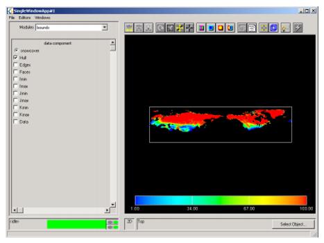 Bounds. Connect it to the red output port of Rd_netCDF_Fld and to the red input port of Uviewer2D. A white box will be drawn around the map which represents the extent of the original data set. Your SingleWindowApp should look like this.
