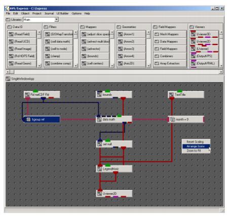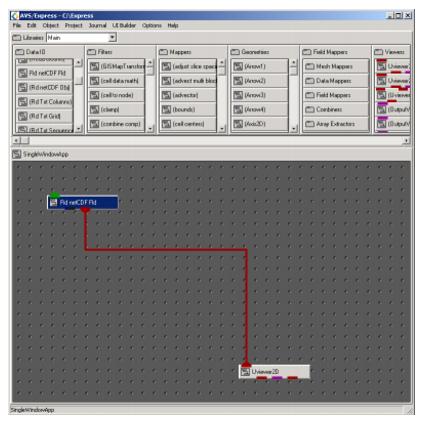 Data IO. Connect the red output port of Rd_netCDF_Fld to the red input port of Uviewer2D. Your network editor should look similar to this.