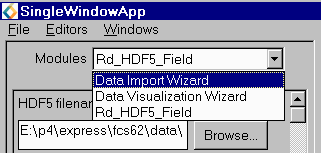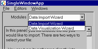 Alternatively, if you are done reading files you can start using the Data Visualization Wizard or normal Network Editor facilities to build your visualization application. If you have already created the Data Visualization Wizard, you can switch to its user interface using the "Modules" menu. |