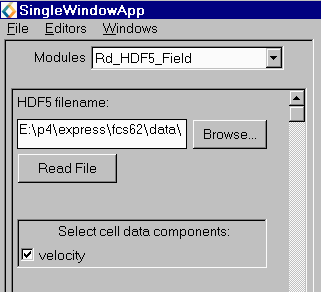 4. If you have entered a valid file name, a short description of the file will appear in the file description box at the bottom of the UI panel and the continue button will be enabled. When you click the continue button the wizard will look at the file name extension and attempt to select the correct reader. For example, if you enter "data/field/hydrogen.fld", the wizard will create a standard Read_Field module. For some files more than one reader may be relevant. For example AVS/Express has two different netCDF readers. In this case a dialog will pop up with a short menu of possible readers to choose from.