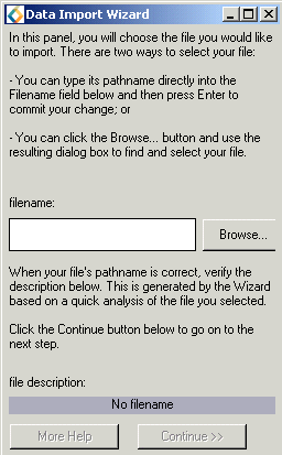 Using the Data Import WizardThe Data Import Wizard assists users in reading data files into AVS/Express fields. While the wizard cannot handle all possible data files, it can recognize file names with common extensions and select the correct AVS/Express reader. You may have created the wizard when you started AVS/Express with the initial "choose application" dialog by checking the box Add Data Import Wizard to application.