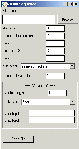 AVS/Express, then you can choose "same as machine". This reader can actually read multiple arrays from the data file. Although many uses of this reader will involve data files with only one array. The user interface used the term "variable." If you are familiar with AVS/Express' terminology for fields, a "variable" corresponds to a node data component. The user interface allows you to specify information for each node data component, such as vector length, data type, (optionally) label and units. For binary data, it is crucial that you supply the correct data type. If you supply the wrong data type, at a minimum your data will be garbled. It is also possible that AVS/Express will malfunction and need to be restarted. For more information please see the Read_Binary_Sequence reference page. |