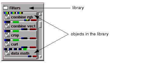 - Object hierarchies - AVS/Express allows you to combine objects to form higher and higher-level objects. Most objects you see in AVS/Express are actually collections of other objects. By opening an object, you can view and modify its underlying definition.