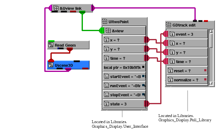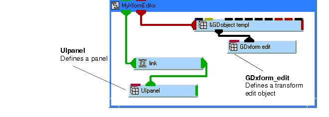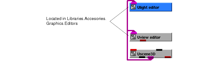 - Instance Uview_editor and Ulight_editor, then connect them to the other objects, as shown in the diagram below. When the editors are instanced, the UIcmd contained in the editors is automatically installed on the Editors pull-down menu.
