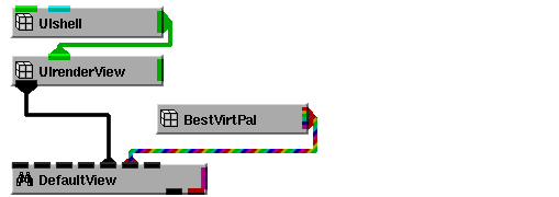 - Instance into the DefaultApplication workspace the following objects: DefaultCamera3D, DefaultLightOn, DefaultLightInfo, DefaultView, and BestVirtPal. Then connect them as shown in the diagram below.