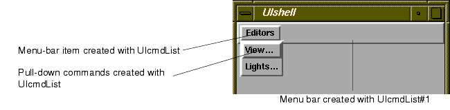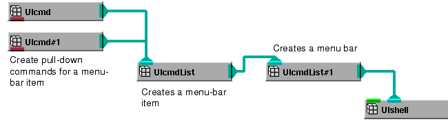 This is just one of many possible configurations. For example, you can connect multiple UIcmdList objects to the UIcmdList that creates the menu bar. This gives you a menu bar with multiple items on it. You can use other UI objects in addition to UIcmd. For example, another UIcmdList object creates a cascading pull-down menu. A UIoption object creates a pull-down command that works like an option box.