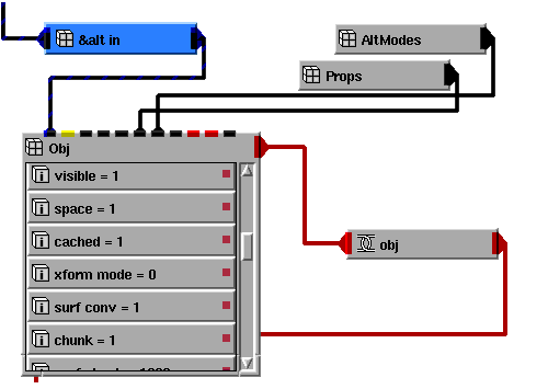 The following diagram, which shows how to do this, is taken from the AttribAltObj example that is found in Libraries.Examples.Graphics_Display. To see the objects shown in the network, maximize Read_Geom, maximize DataObject, maximize AltObject. Open AltModes, then open mode[5].