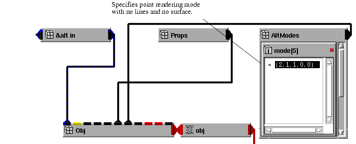 The following diagram, which shows how to do this, is taken from the Bound1AltObj example that is found in Libraries.Examples.Graphics_Display. To see the objects shown in the network, maximize Read_Geom, maximize DataObject, maximize AltObject. Open AltModes, then open mode[5].
