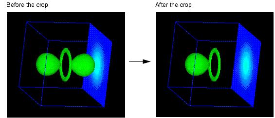 The crop object crops a set of field data along one or more selected dimensions. In your application, you insert crop between Read_Field and isosurface so that the application will display an isosurface of data that has been cropped.