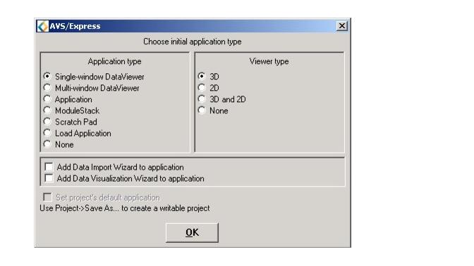 To enable this choice as the default, you must save the current session in a project file before exiting, When you start AVS/Express again using this project, the Network Editor loads your choice of application as the default and does not display the start-up dialog.