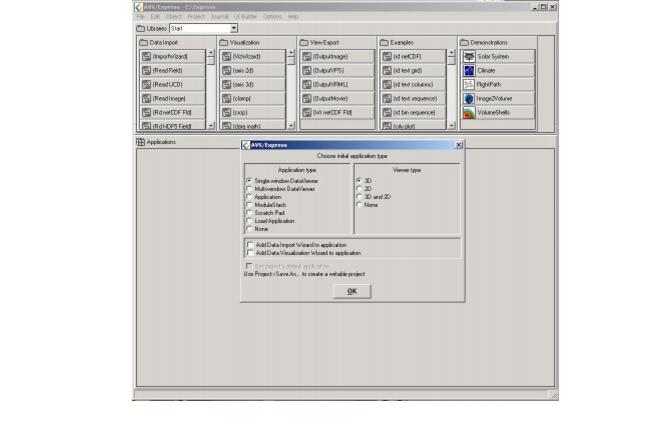 If you select None, AVS/Express starts-up with the root Applications object in the workspace. The Applications object is the ancestor of all applications in AVS/Express. You can instance a template application from a library into Applications. For example, you might want to instance one of the example applications from the Examples library.