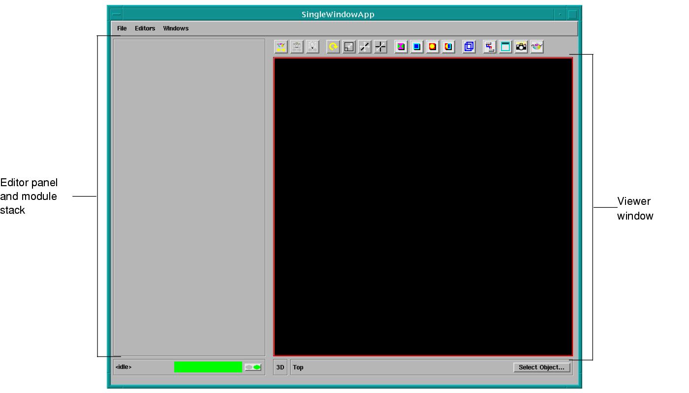The Single-window DataViewer opens one window that combines a viewer window in which you can display your data or image, and a set of editors that you can use to customize and interact with the viewer configuration: