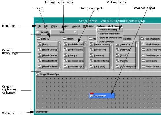 By building up a hierarchy of objects, you can use AVS/Express to build a complete application. An application in AVS/Express is just a special kind of macro object that is not contained within other macros. The Network Editor's workspace represents an application object.The application object is usually created by AVS/Express when the process is started and is not destroyed until you exit the application.