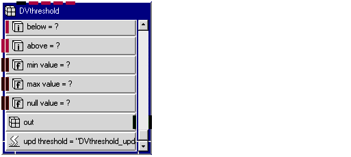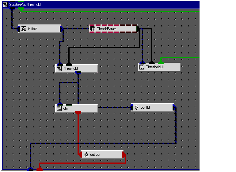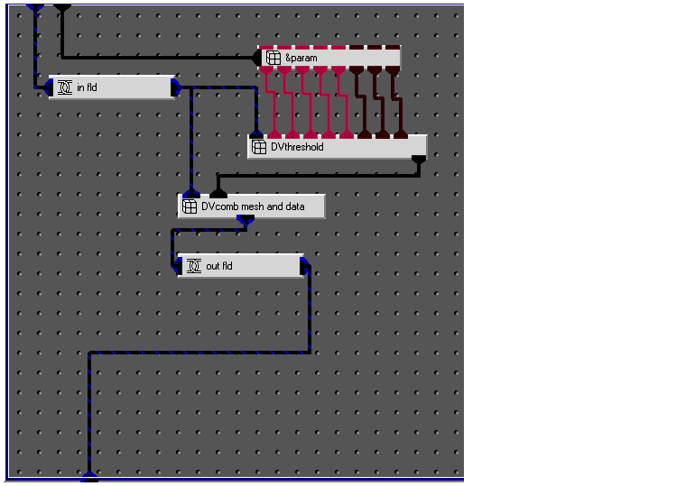 The DV macros are constructed in three layers. The lowest-level object is called a primitive. This is an object of type module or group (depending on whether it has procedural code "behind" it) whose inputs and outputs are precisely the type needed for the module to perform its function. There is no user interface at this level. The module directly exports the ports for its input and output data and its parameters. Many visualization primitives operate on only part of a Field. For example, the DVthreshold primitive operates only on the values of a Field's Node_Data. This module does not affect the Field's Mesh, and therefore specifies its input as not requiring that a Mesh be present.
