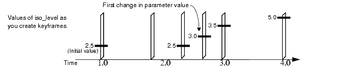 For example, the following diagram illustrates a series of keyframes you might create to animate the iso_level parameter in an Iso Surface visualization. In the first three keyframes you perform other operations and leave the iso_level parameter unchanged from its initial value. In the fourth and following keyframes, you change the iso_level.