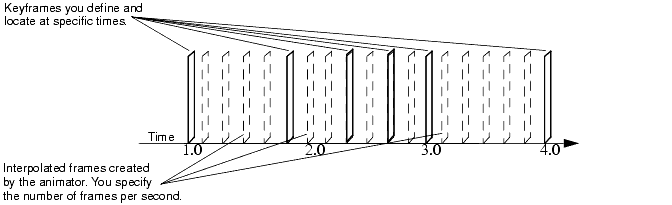 To create a keyframe animation, you create a series of views, the "keyframes," that define known points in the animation you want to produce. The animator then adds frames between the keyframes to produce an animated sequence. These new frames are created by interpolating parameters of the view, such as size, position, or color, from one keyframe to the next. You control the number of frames that are created by specifying the number of frames per second for the animation. The following illustration shows the relationship between keyframes and interpolated frames.