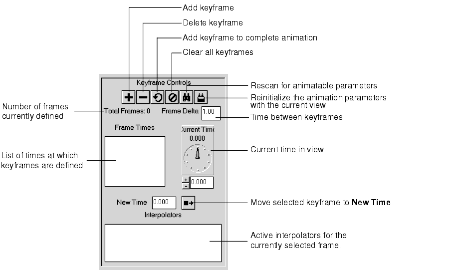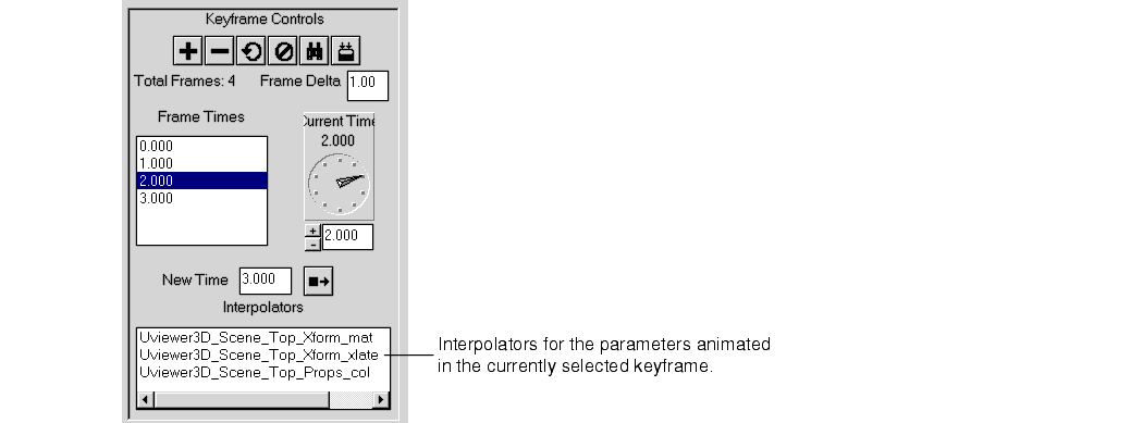 As you add keyframes, the times at which keyframes are defined is displayed in the Frame Times listing. You can display the frame associated with a time by clicking on it in this list. When you select a time from the Frame Times list, the Interpolators listing is also updated to show the interpolators that are active for the corresponding time frame. This tells you which parameters are included in the Viewer animation.