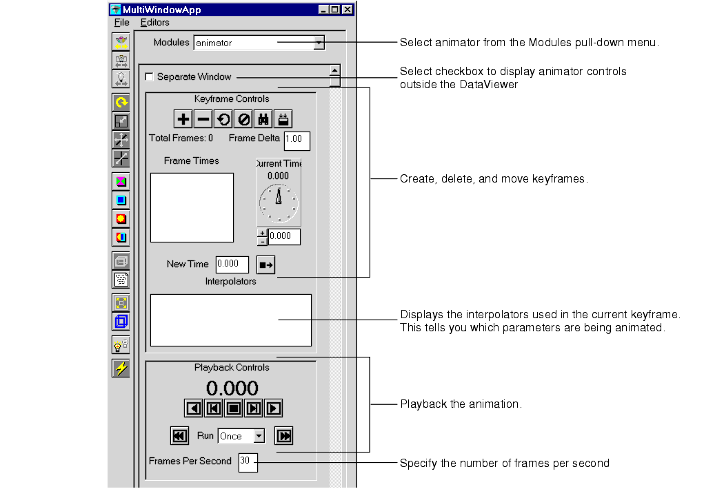 You can select the Separate Window checkbox to display the animator controls in their own window outside the DataViewer panel. This allows you to use the DataViewer editors and other module's controls to create your keyframes while you are building the animation, without having to switch the editor panel back and forth between the DataViewer and animator controls.