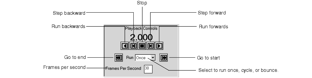As shown in the illustration above, you can use the buttons on the Playback Controls panel to run or step through the animation in either direction, or to go directly to the beginning or end of the sequence.