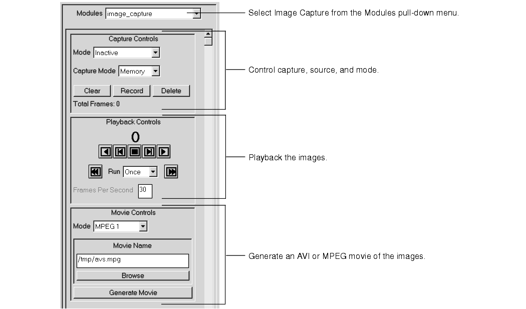 You use the Capture Controls to enable capture and to control how the images are recorded. You can specify whether the module stores the images in your computer's memory or in temporary files on your disk.