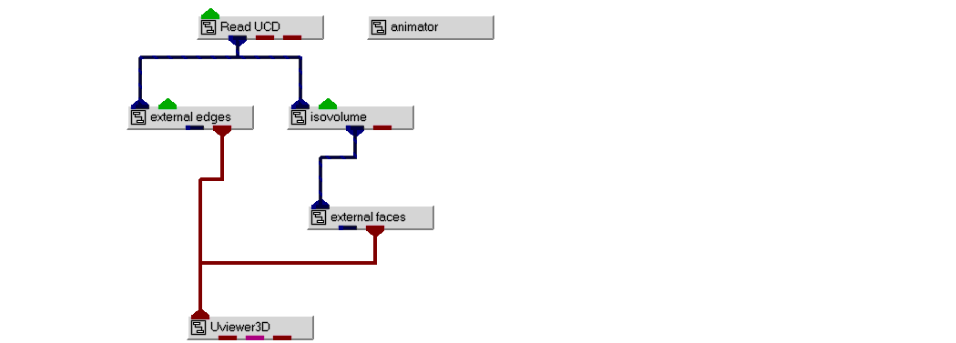 You instance the animator object from the DataIO sublibrary on the Main library page into the application you want to animate. Place the animator module at the same level in your application as the view you want to animate. AVS/Express automatically establishes a connection from the animator object to the viewer; you do not need to make a visible connection between the animator and your application. For example, the following diagram shows the animator module added to the network for the Isovolume example found in the Examples.Visualization sublibrary: