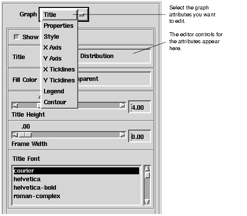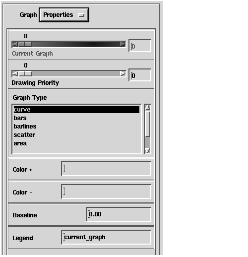 You use the Graph Type list to select the graph type for the current graph. You can choose from curve (the default), bar, barlines, scatter, area, staircase, or stairarea.