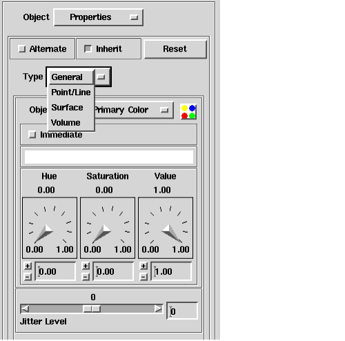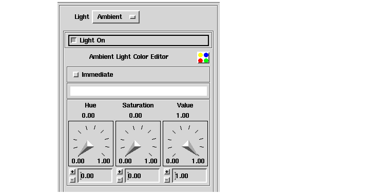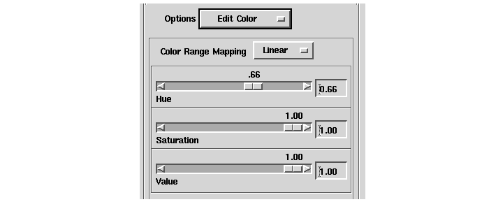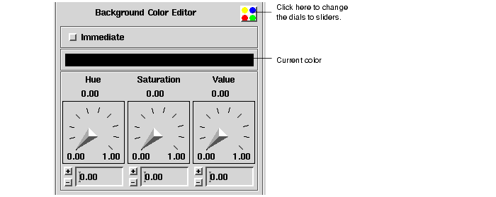 You can adjust the Hue, Saturation, and Value dials to specify the hue, saturation and brightness parameters, respectively, of an HSV color space that defines the background color of the Viewer window. An HSV color space can be thought of as an inverted cone: