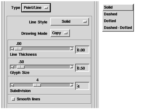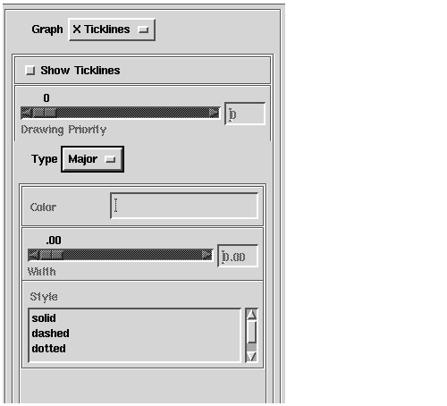 - Use the Style scrolling list to select the style of line used to render the ticklines. You can choose solid (the default), dashed, dotted, or dasheddotted (an alternating pattern of dashes and dots).