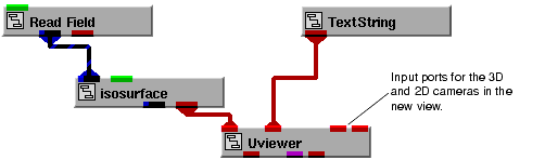 - New Objects - When you create a view in the New Objects mode, AVS/Express creates an empty view and adds input ports for the cameras you have specified to the Uviewer in the Network Editor. For example, here is the Uviewer in the example application after adding a view with both 2D and 3D cameras: