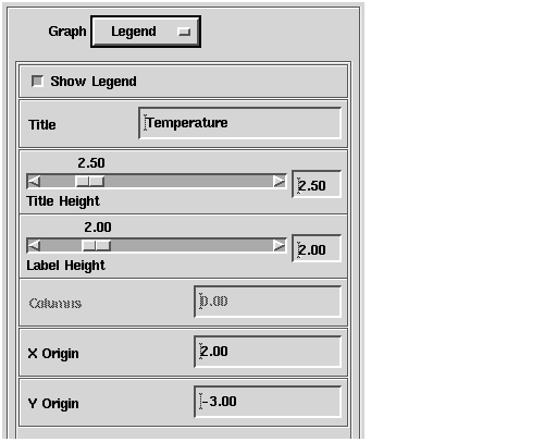 You specify the legend's text and appearance by selecting values for the Title, Columns, X Origin, and Y Origin fields; and the Title Height and Label Height slider bars.