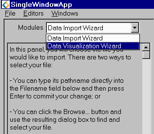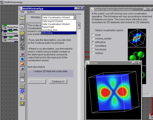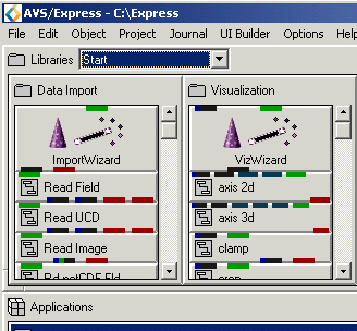 Using the Data Visualization WizardThe Data Visualization Wizard will help you to create an simple visualization application without having to learn much about using the Network Editor. The Data Visualization Wizard, is not for building large, complex applications. It can be used by new users who are unfamiliar with the Network Editor editor and by experiences uses who want to quickly build a simple application. You may have created the wizard when you started AVS/Express with the initial "choose application" dialog.