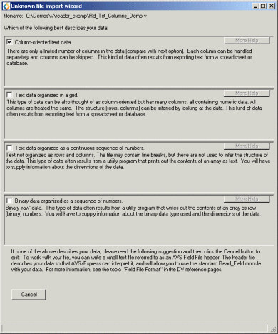 Using the Data Import WizardThe Data Import Wizard assists users in reading data files into AVS/Express fields. While the wizard cannot handle all possible data files, it can recognize file names with common extensions and select the correct AVS/Express reader. You may have created the wizard when you started AVS/Express with the initial "choose application" dialog by checking the box Add Data Import Wizard to application.
