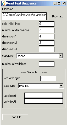 This reader can actually read multiple arrays from the data file. Although many uses of this reader will involve data files with only one array. The user interface used the term "variable." If you are familiar with AVS/Express' terminology for fields, a "variable" corresponds to a node data component. The user interface allows you to specify information for each node data component, such as vector length, data type, (optionally) label and units. For more information please see the Read_Text_Sequence reference page. |